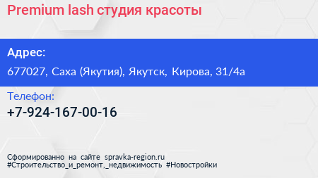 Premium lash, студия красоты по адресу 677027, Саха (Якутия), Якутск, Кирова, 31/4а в дальнейшем Организация, размещена в следующих категориях:
