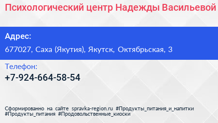 Психологический центр Надежды Васильевой по адресу 677027, Саха (Якутия), Якутск, Октябрьская, 3 в дальнейшем Организация, размещена в следующих категориях: