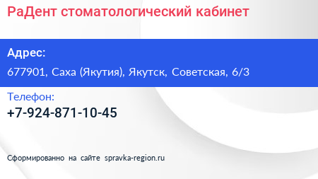 РаДент, стоматологический кабинет по адресу 677901, Саха (Якутия), Якутск, Советская, 6/3 в дальнейшем Организация, размещена в следующих категориях: