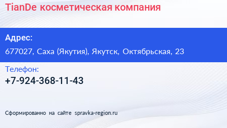 TianDe, косметическая компания по адресу 677027, Саха (Якутия), Якутск, Октябрьская, 23 в дальнейшем Организация, размещена в следующих категориях: