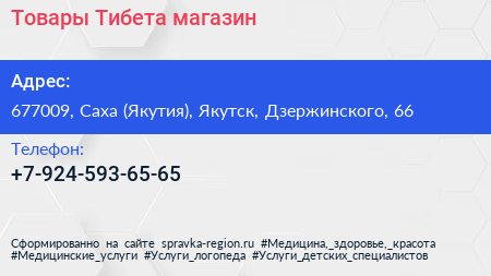 Товары Тибета, магазин по адресу 677009, Саха (Якутия), Якутск, Дзержинского, 66 в дальнейшем Организация, размещена в следующих категориях: