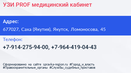 УЗИ-PROF, медицинский кабинет по адресу 677027, Саха (Якутия), Якутск, Ломоносова, 45 в дальнейшем Организация, размещена в следующих категориях: