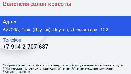 Валенсия, салон красоты по адресу 677008, Саха (Якутия), Якутск, Лермонтова, 102 в дальнейшем Организация, размещена в следующих категориях: