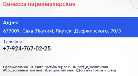 Ванесса, парикмахерская по адресу 677009, Саха (Якутия), Якутск, Дзержинского, 70/3 в дальнейшем Организация, размещена в следующих категориях: