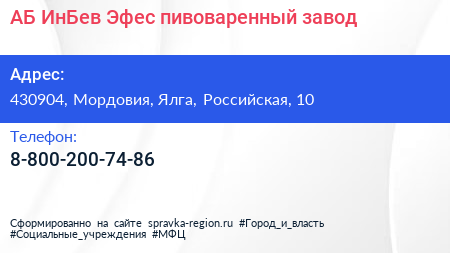 АБ ИнБев Эфес, пивоваренный завод по адресу 430904, Мордовия, Ялга, Российская, 10 в дальнейшем Организация, размещена в следующих категориях: