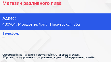 Магазин разливного пива по адресу 430904, Мордовия, Ялга, Пионерская, 35а в дальнейшем Организация, размещена в следующих категориях:
