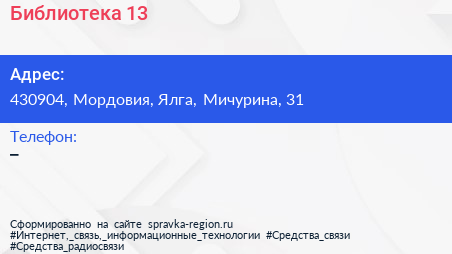 Библиотека №13 по адресу 430904, Мордовия, Ялга, Мичурина, 31 в дальнейшем Организация, размещена в следующих категориях: