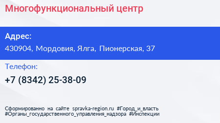 Многофункциональный центр по адресу 430904, Мордовия, Ялга, Пионерская, 37 в дальнейшем Организация, размещена в следующих категориях: