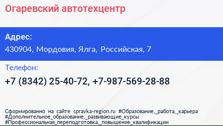 Огаревский, автотехцентр по адресу 430904, Мордовия, Ялга, Российская, 7 в дальнейшем Организация, размещена в следующих категориях: