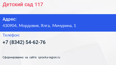 Детский сад №117 по адресу 430904, Мордовия, Ялга, Мичурина, 1 в дальнейшем Организация, размещена в следующих категориях: