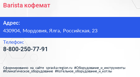 Barista, кофемат по адресу 430904, Мордовия, Ялга, Российская, 23 в дальнейшем Организация, размещена в следующих категориях:
