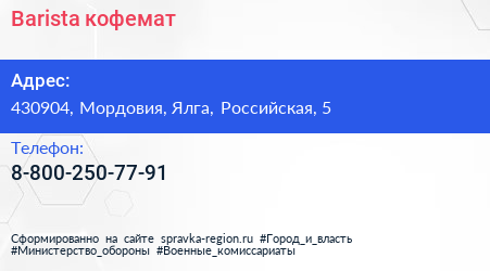 Barista, кофемат по адресу 430904, Мордовия, Ялга, Российская, 5 в дальнейшем Организация, размещена в следующих категориях: