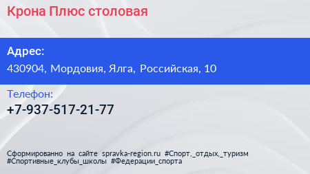 Крона Плюс, столовая по адресу 430904, Мордовия, Ялга, Российская, 10 в дальнейшем Организация, размещена в следующих категориях:
