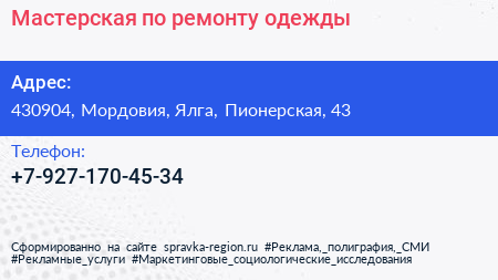Мастерская по ремонту одежды по адресу 430904, Мордовия, Ялга, Пионерская, 43 в дальнейшем Организация, размещена в следующих категориях: