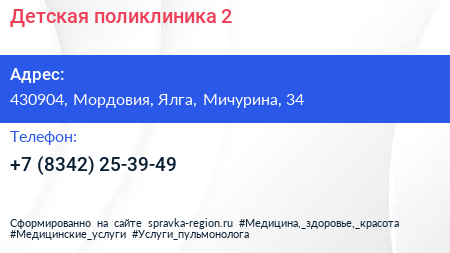 Детская поликлиника №2 по адресу 430904, Мордовия, Ялга, Мичурина, 34 в дальнейшем Организация, размещена в следующих категориях: