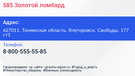 585*Золотой, ломбард по адресу 627011, Тюменская область, Ялуторовск, Свободы, 177 ст1 в дальнейшем Организация, размещена в следующих категориях: