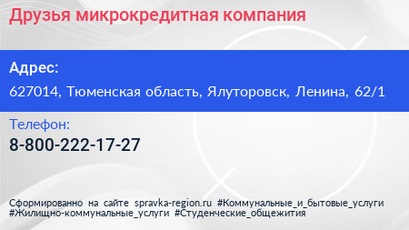 Друзья, микрокредитная компания по адресу 627014, Тюменская область, Ялуторовск, Ленина, 62/1 в дальнейшем Организация, размещена в следующих категориях: