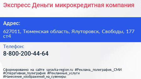 Экспресс Деньги, микрокредитная компания по адресу 627011, Тюменская область, Ялуторовск, Свободы, 177 ст4 в дальнейшем Организация, размещена в следующих категориях: