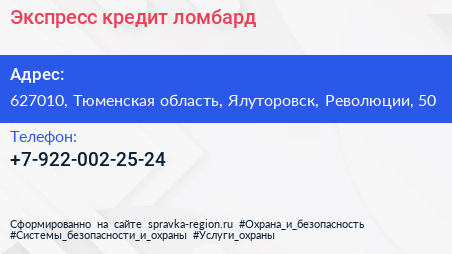 Экспресс-кредит, ломбард по адресу 627010, Тюменская область, Ялуторовск, Революции, 50 в дальнейшем Организация, размещена в следующих категориях: