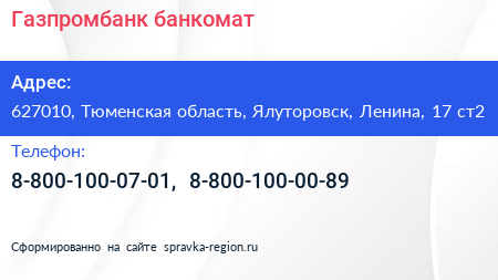 Газпромбанк, банкомат по адресу 627010, Тюменская область, Ялуторовск, Ленина, 17 ст2 в дальнейшем Организация, размещена в следующих категориях: