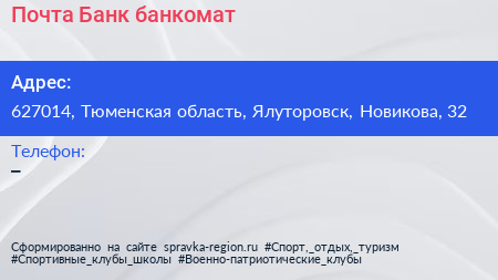 Почта Банк, банкомат по адресу 627014, Тюменская область, Ялуторовск, Новикова, 32 в дальнейшем Организация, размещена в следующих категориях: