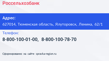 Россельхозбанк по адресу 627014, Тюменская область, Ялуторовск, Ленина, 62/1 в дальнейшем Организация, размещена в следующих категориях: