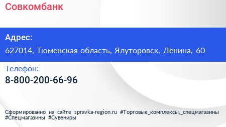 Совкомбанк по адресу 627014, Тюменская область, Ялуторовск, Ленина, 60 в дальнейшем Организация, размещена в следующих категориях:
