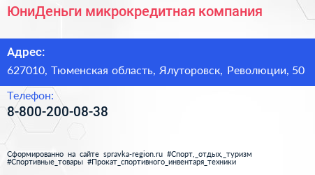 ЮниДеньги, микрокредитная компания по адресу 627010, Тюменская область, Ялуторовск, Революции, 50 в дальнейшем Организация, размещена в следующих категориях: