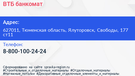 ВТБ, банкомат по адресу 627011, Тюменская область, Ялуторовск, Свободы, 177 ст11 в дальнейшем Организация, размещена в следующих категориях: