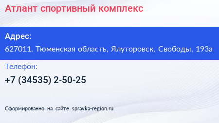 Атлант, спортивный комплекс по адресу 627011, Тюменская область, Ялуторовск, Свободы, 193а в дальнейшем Организация, размещена в следующих категориях: