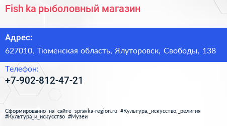 Fish ka, рыболовный магазин по адресу 627010, Тюменская область, Ялуторовск, Свободы, 138 в дальнейшем Организация, размещена в следующих категориях: