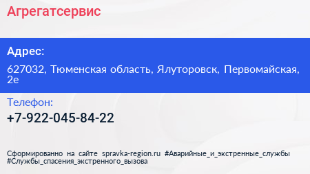 Агрегатсервис по адресу 627032, Тюменская область, Ялуторовск, Первомайская, 2е в дальнейшем Организация, размещена в следующих категориях: