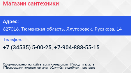 Магазин сантехники по адресу 627016, Тюменская область, Ялуторовск, Русакова, 14 в дальнейшем Организация, размещена в следующих категориях: