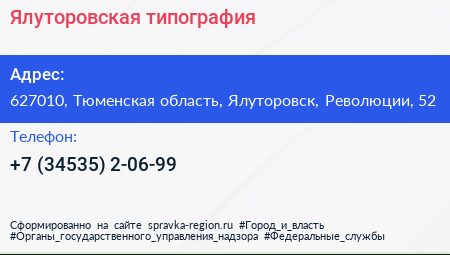Ялуторовская типография по адресу 627010, Тюменская область, Ялуторовск, Революции, 52 в дальнейшем Организация, размещена в следующих категориях: