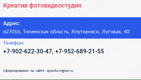 Креатив, фотовидеостудия по адресу 627016, Тюменская область, Ялуторовск, Луговая, 40 в дальнейшем Организация, размещена в следующих категориях: