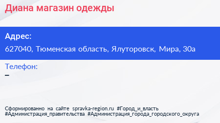 Диана, магазин одежды по адресу 627040, Тюменская область, Ялуторовск, Мира, 30а в дальнейшем Организация, размещена в следующих категориях: