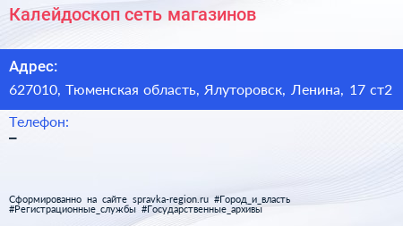 Калейдоскоп, сеть магазинов по адресу 627010, Тюменская область, Ялуторовск, Ленина, 17 ст2 в дальнейшем Организация, размещена в следующих категориях: