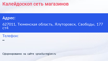 Калейдоскоп, сеть магазинов по адресу 627011, Тюменская область, Ялуторовск, Свободы, 177 ст4 в дальнейшем Организация, размещена в следующих категориях: