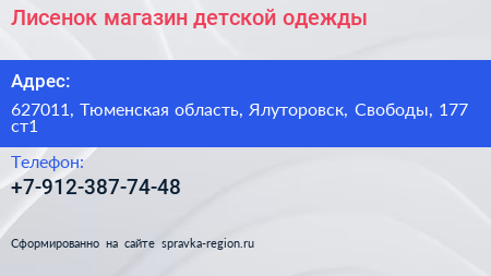 Лисенок, магазин детской одежды по адресу 627011, Тюменская область, Ялуторовск, Свободы, 177 ст1 в дальнейшем Организация, размещена в следующих категориях: