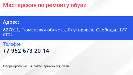 Мастерская по ремонту обуви по адресу 627011, Тюменская область, Ялуторовск, Свободы, 177 ст11 в дальнейшем Организация, размещена в следующих категориях: