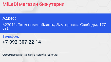 MiLeDi, магазин бижутерии по адресу 627011, Тюменская область, Ялуторовск, Свободы, 177 ст1 в дальнейшем Организация, размещена в следующих категориях: