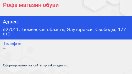 Рофа, магазин обуви по адресу 627011, Тюменская область, Ялуторовск, Свободы, 177 ст1 в дальнейшем Организация, размещена в следующих категориях:
