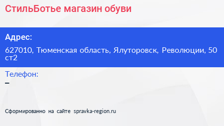 СтильБотье, магазин обуви по адресу 627010, Тюменская область, Ялуторовск, Революции, 50 ст2 в дальнейшем Организация, размещена в следующих категориях: