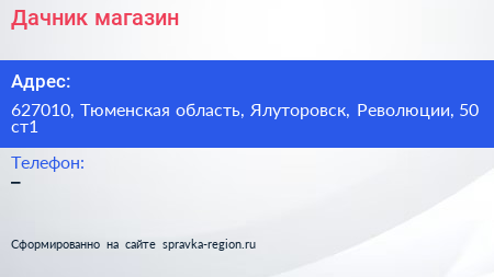 Дачник, магазин по адресу 627010, Тюменская область, Ялуторовск, Революции, 50 ст1 в дальнейшем Организация, размещена в следующих категориях: