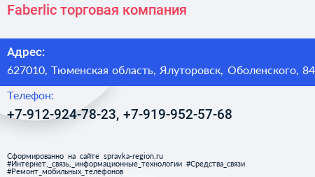 Faberlic, торговая компания по адресу 627010, Тюменская область, Ялуторовск, Оболенского, 84 в дальнейшем Организация, размещена в следующих категориях: