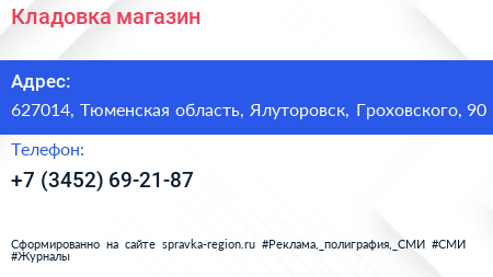 Кладовка, магазин по адресу 627014, Тюменская область, Ялуторовск, Гроховского, 90 в дальнейшем Организация, размещена в следующих категориях: