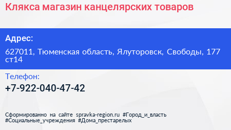 Клякса, магазин канцелярских товаров по адресу 627011, Тюменская область, Ялуторовск, Свободы, 177 ст14 в дальнейшем Организация, размещена в следующих категориях: