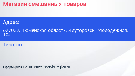 Магазин смешанных товаров по адресу 627032, Тюменская область, Ялуторовск, Молодёжная, 10а в дальнейшем Организация, размещена в следующих категориях: