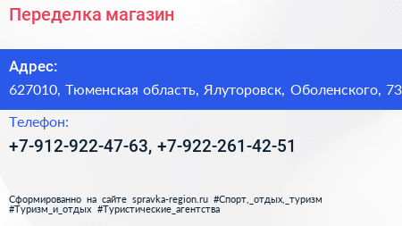 Переделка, магазин по адресу 627010, Тюменская область, Ялуторовск, Оболенского, 73 в дальнейшем Организация, размещена в следующих категориях: