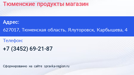 Тюменские продукты, магазин по адресу 627017, Тюменская область, Ялуторовск, Карбышева, 4 в дальнейшем Организация, размещена в следующих категориях: